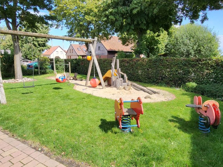 Die Zimmer unserer eigenen Kinder in der ersten Etage werden vor allem als Schlafräume für die Tageskinder genutzt. Auch im elterlichen Schlafzimmer und im Büro im zweiten Geschoss halten die Kleinen Mittagsruhe. Durch die vielen Schlafmöglichkeiten im Haus hat bei Bedarf jedes Tageskind die Möglichkeit auf einen eigenen separaten Schlafraum. Alle Etagen sind mit Brandmeldern ausgestattet. Auf dem geschützten vorderen Innenhof oder im weitläufigen Garten ist viel Platz zum Klettern, Schaukeln und Buddeln. Je nach aktuellen Wetter- oder Temperaturverhältnissen können wir den täglichen Spielort im Eigenheim wählen.