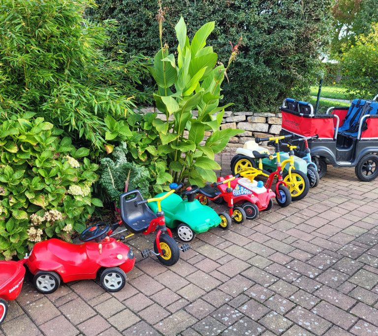Es stehen einige Bobbycars, Roller, Drei- und Laufräder für einen gemeinsamen Fahrspaß zur Verfügung, um unter anderem Balance und Gleichgewicht zu trainieren oder sich ausprobieren. Man findet im Garten aber auch genügend Möglichkeiten wie Steine und Baumstämme, die extra für die Kleinen angelegt wurden. Auch hier sind der motorischen Entfaltung keine Grenzen gesetzt. Unsere zwei Ponys leben direkt angrenzend an das Areal auf einer Wiese.