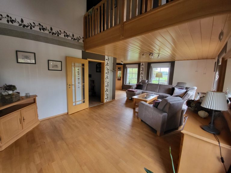 In unserer ehemaligen Scheune erstreckt sich der Wohnbereich über drei Etagen, welche auch alle von den Tageskindern mit genutzt werden. Im Erdgeschoss befinden sich die Küche, das Wohnzimmer und ein kleines Gäste-WC. Hier findet die überwiegende Betreuung statt. In der Küche werden generell alle Mahlzeiten am Esstisch eingenommen. Hochwertige Reisehochstühlen unterstützen die Kinder beim sicheren Sitzen. Hier finden auch die kreative Beschäftigungen wie z.B. Kneten, Puzzeln und Malen statt. Im geräumigen Wohnzimmer, erfolgt in der Regel das gemeinsame Spielen oder Singen. In dem Gäste WC befindet sich eine Wickelkommode, sowie ein separater Toilettensitz für Kinder, die sich im „Trocken werden“ üben.In dem angrenzenden hellen Scheunengebäude leben, fressen und genießen unter anderem unsere Meerschweinchen in einem kleinen Stall. Hier ist so viel Platz, dass es uns auch bei extremen Wetterverhältnissen die Möglichkeit bietet, geschützt toben, rennen und spielen zu können.
